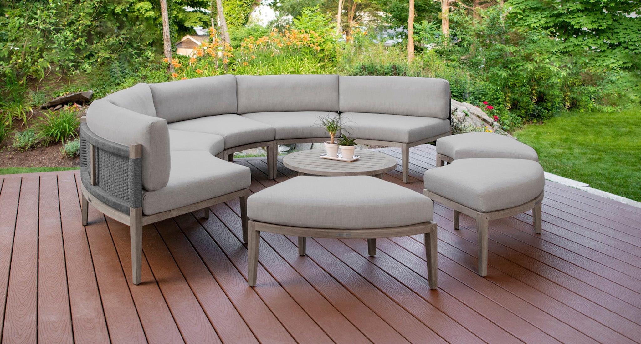 The Santorini Collection stands out from other outdoor furniture offerings by Madbury Road due to its unique circular outdoor sectional and daybed design, which can accommodate up to 8 individuals. It is available in espresso or driftwood gray all-weather wicker, as well as teak and all-weather rope.