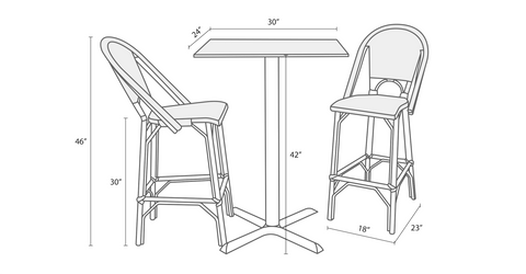The Avery Collection is inspired from classic European cafés and bistros. The chairs are crafted with hand-woven, gray and white wash all-weather wicker and bamboo powder coated aluminum framing. The tabletop features a clean white finish supported by a sturdy 4-prong base.