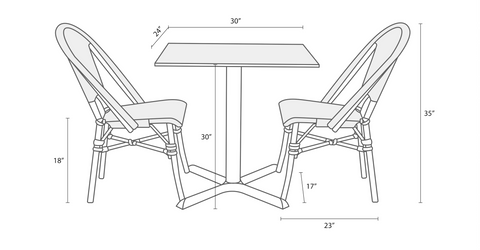 The Avery Collection is inspired from classic European cafés and bistros. The chairs are crafted with hand-woven, gray and white wash all-weather wicker and bamboo powder coated aluminum framing. The tabletop features a clean white finish supported by a sturdy 4-prong base.
