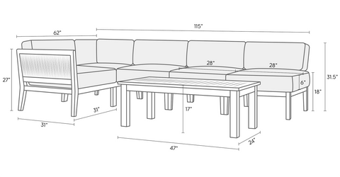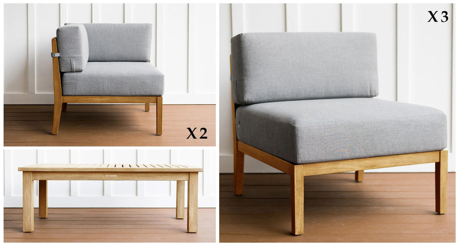 The Capri Teak & Rope Outdoor Sectional includes a 5-piece sectional and matching coffee table. Crafted from sustainably sourced grade A teak wood, the set features intricate handwoven gray all-weather rope and luxurious Sunbrella Cast Slate cushions. Its versatile design provides an assortment of layout options to seamlessly complement your outdoor deck or patio.