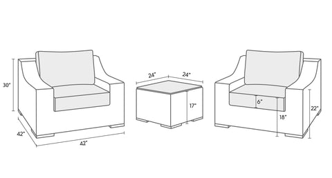 The Corsica boasts a classic look with a driftwood grey colored weave, wide arms and backrests, and deep seating. The outdoor club chair set includes two club chairs and one end table with a tempered glass top.