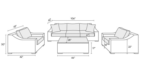 The Corsica boasts a classic look with a driftwood grey colored weave, wide arms and backrests, and deep seating. The outdoor sofa & club chair set includes a 3 seater sofa, 2 club chairs, and coffee table with a tempered glass top.