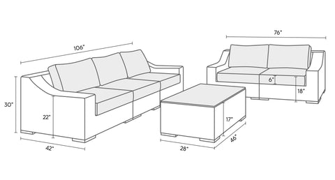 The Corsica boasts a classic look with a driftwood grey colored weave, wide arms and backrests, and deep seating. The outdoor sofa & loveseat set includes a 3 seater sofa, 2 seater loveseat, and coffee table with a tempered glass top.