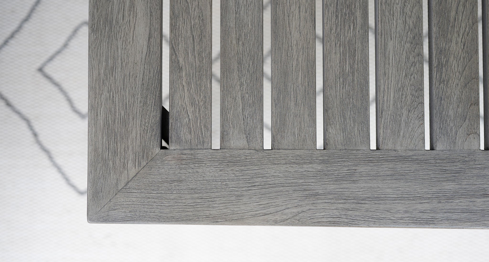 The Fiji Coffee Table features FSC certified, gray wash teak. It is a versatile table option to add on to sectional and sofa sets, and large enough to hold drinks and appetizers.