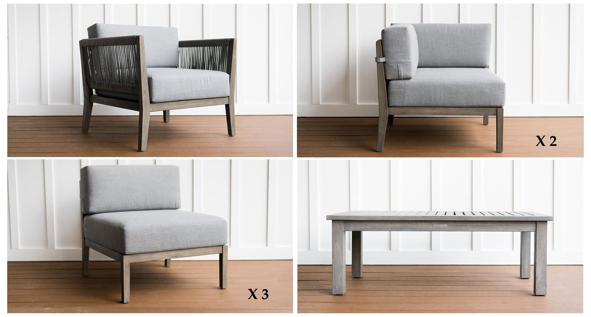 The Fiji Collection is constructed with FSC certified, gray wash teak wood, hand woven gray all-weather rope, and Sunbrella Cast Slate cushions. The versatile design offers an array of configurations to best fit your deck or patio.