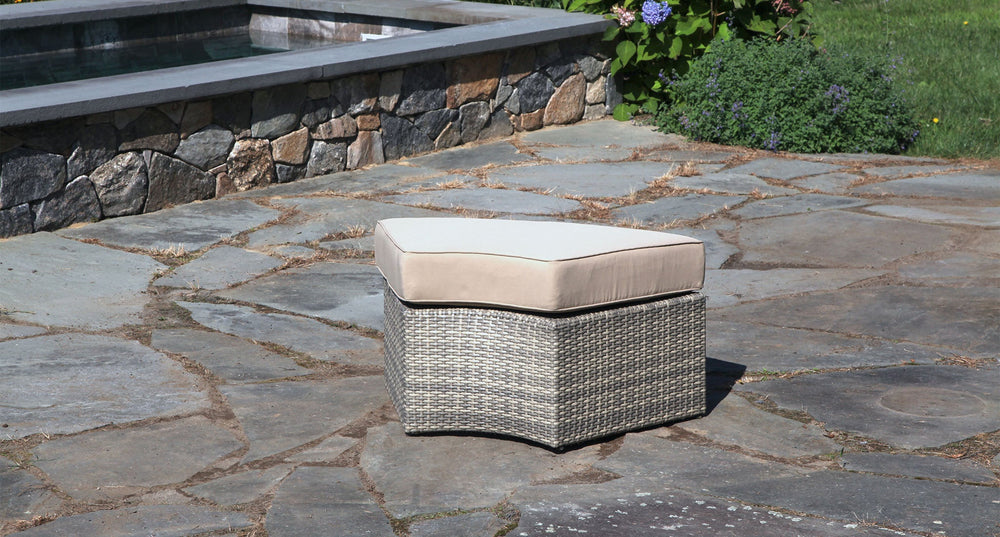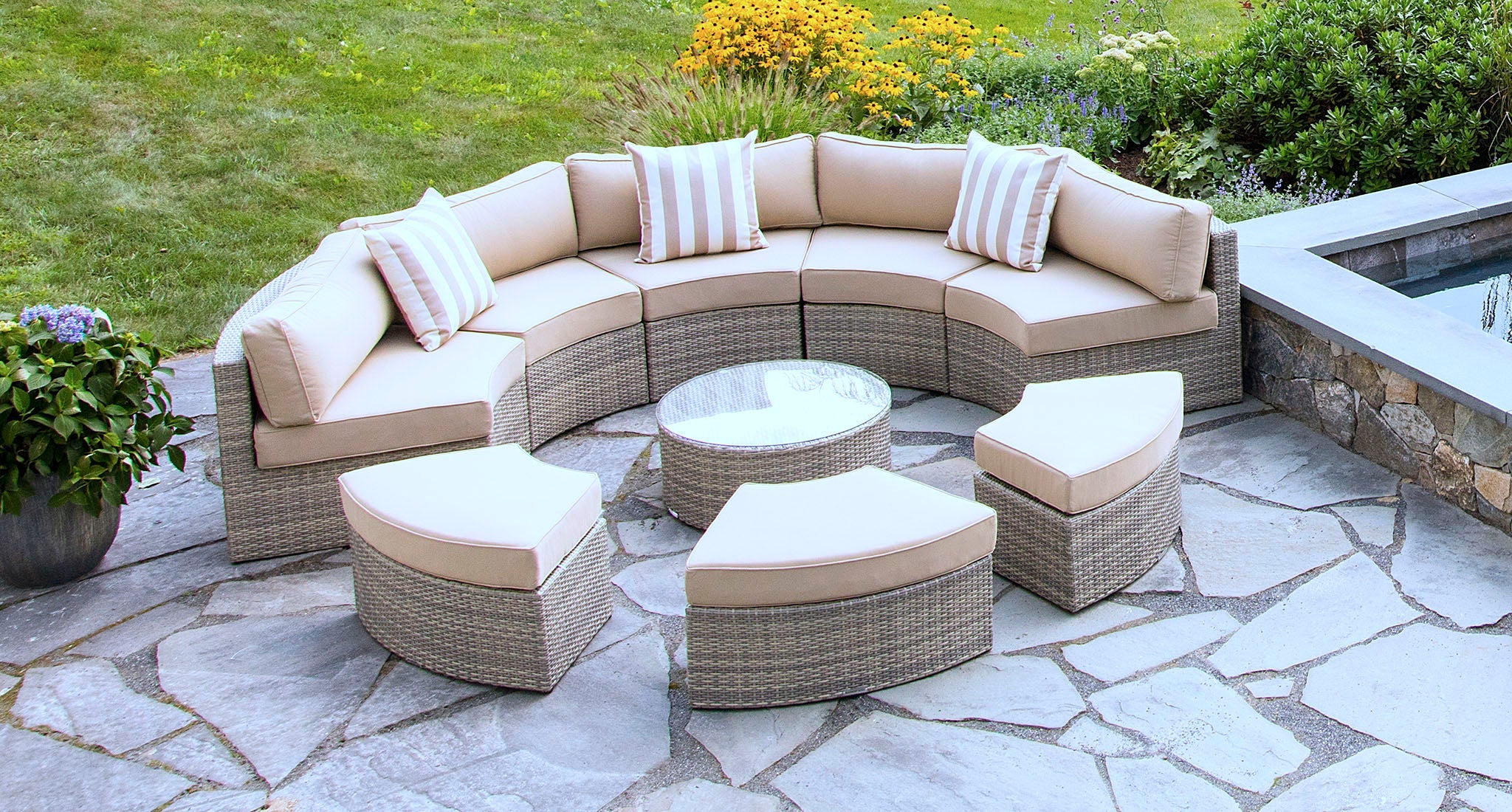 The Santorini is a round outdoor sectional that is built to entertain. The versatile design offers incredible functionality with numerous configurations. The ottomans can be used as seating, or they can be turned around to fit flush against the inside of the sectional to create an outdoor daybed. The set includes a 5 piece sectional, 3 ottomans, and coffee table with a tempered glass top.