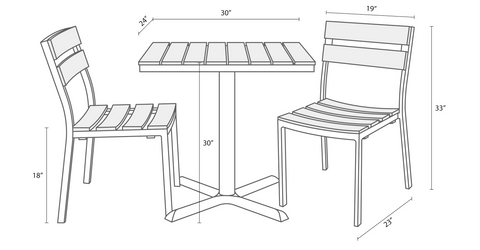 The Milloy is made with weathered black synthetic teak slats and silver powder coated aluminum framing. The rectangular 2-top design adds versatility for combining sets together for 4 or 6 patrons.