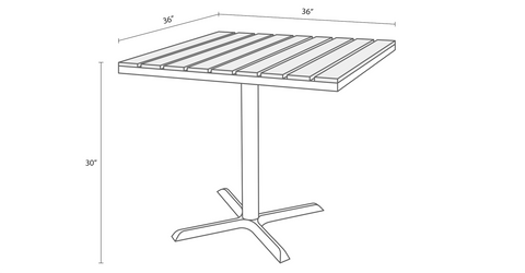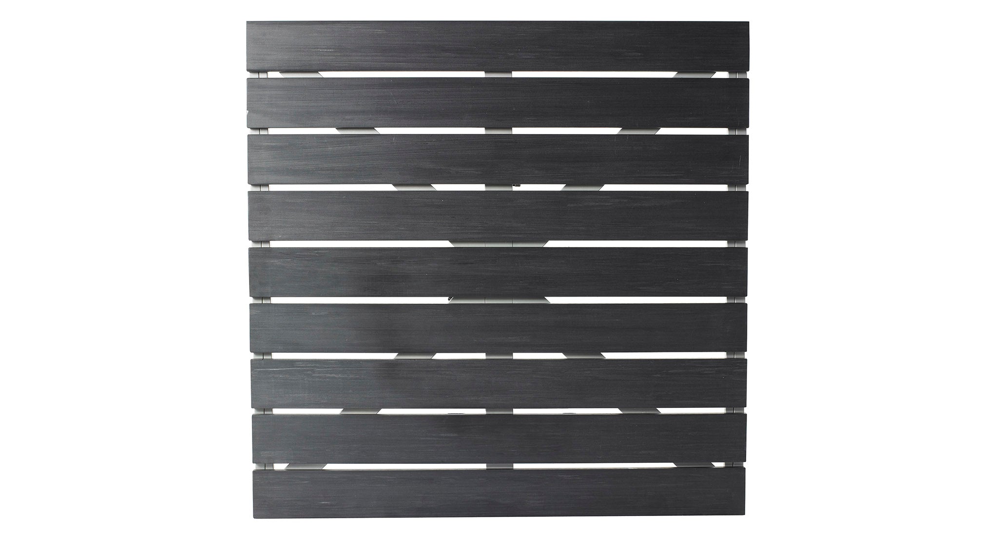 The Milloy 4-Top Outdoor Dining Table features weathered black powder coated synthetic teak slats and silver powder coated aluminum framing.