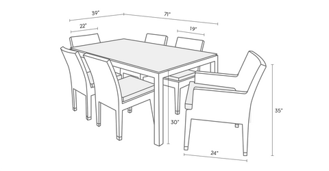 The Salina Outdoor Dining Set for 6 is crafted with our espresso all-weather wicker and Sunbrella cushions. Powder coated aluminum framing boasts a strong, durable, and rust proof base. The set includes a dining table with tempered glass top and standard size umbrella hole, four side chairs, and two arm chairs.