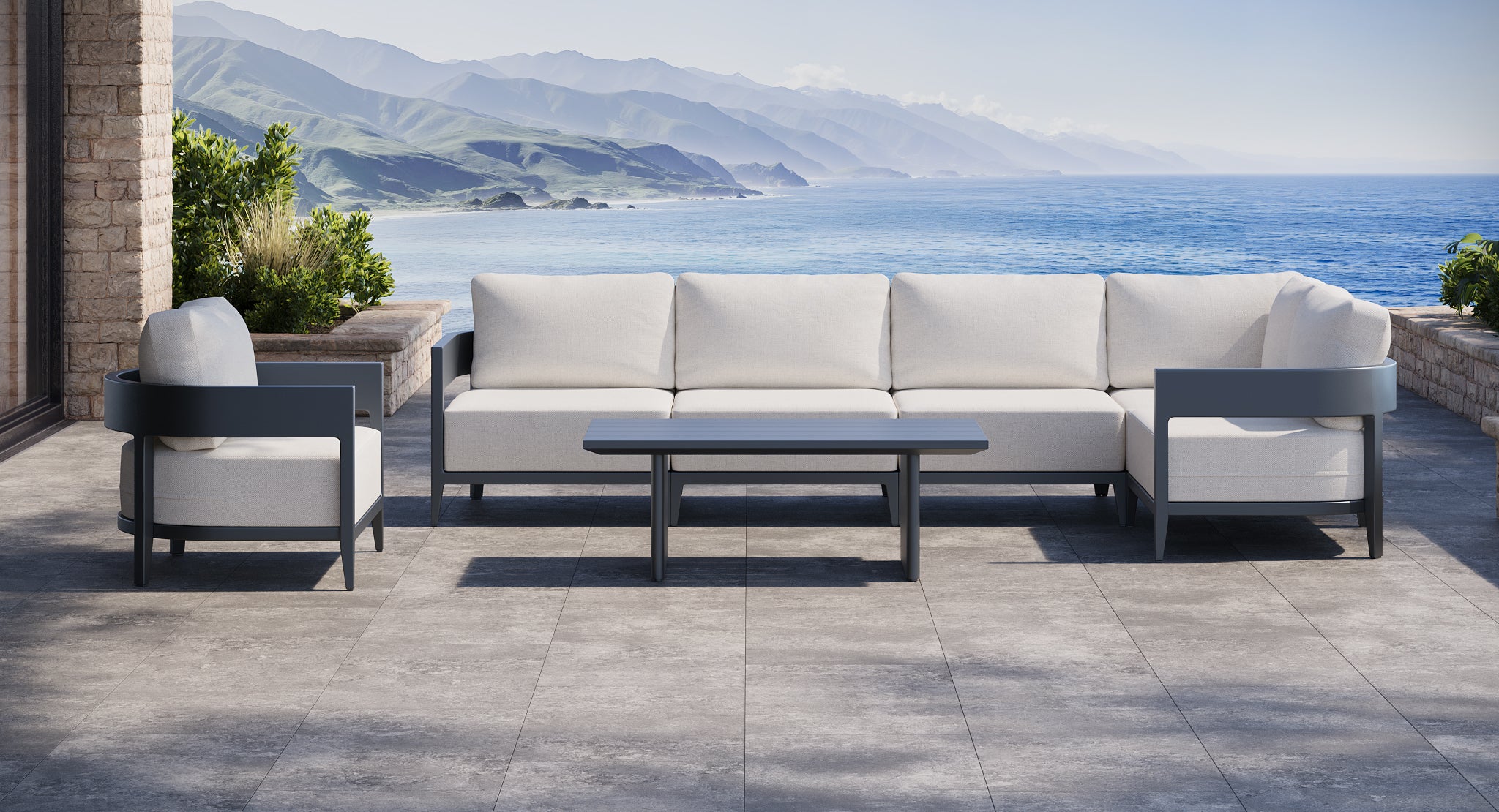 Introducing the Atlantic Collection, where bold architectural lines meet uncompromising comfort. Designed for the modern entertainer, this collection is defined by its fluid, sculptural silhouette - highlighted by the elegant curved design of the armrests and the distinctive slatted metal base of the tables. The frame is constructed from premium, matte gray powder-coated aluminum, offering a sleek, industrial-chic aesthetic that stands up to the elements.