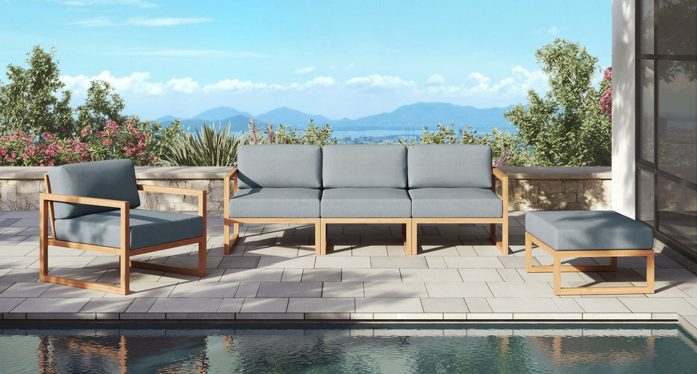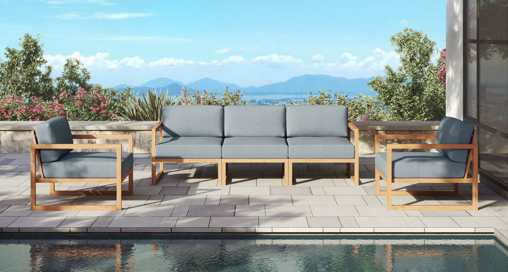 The Pacific Collection is crafted with Grade A teak frames and Sunbrella Cast Slate cushions. The design features angled backrests for natural comfort.