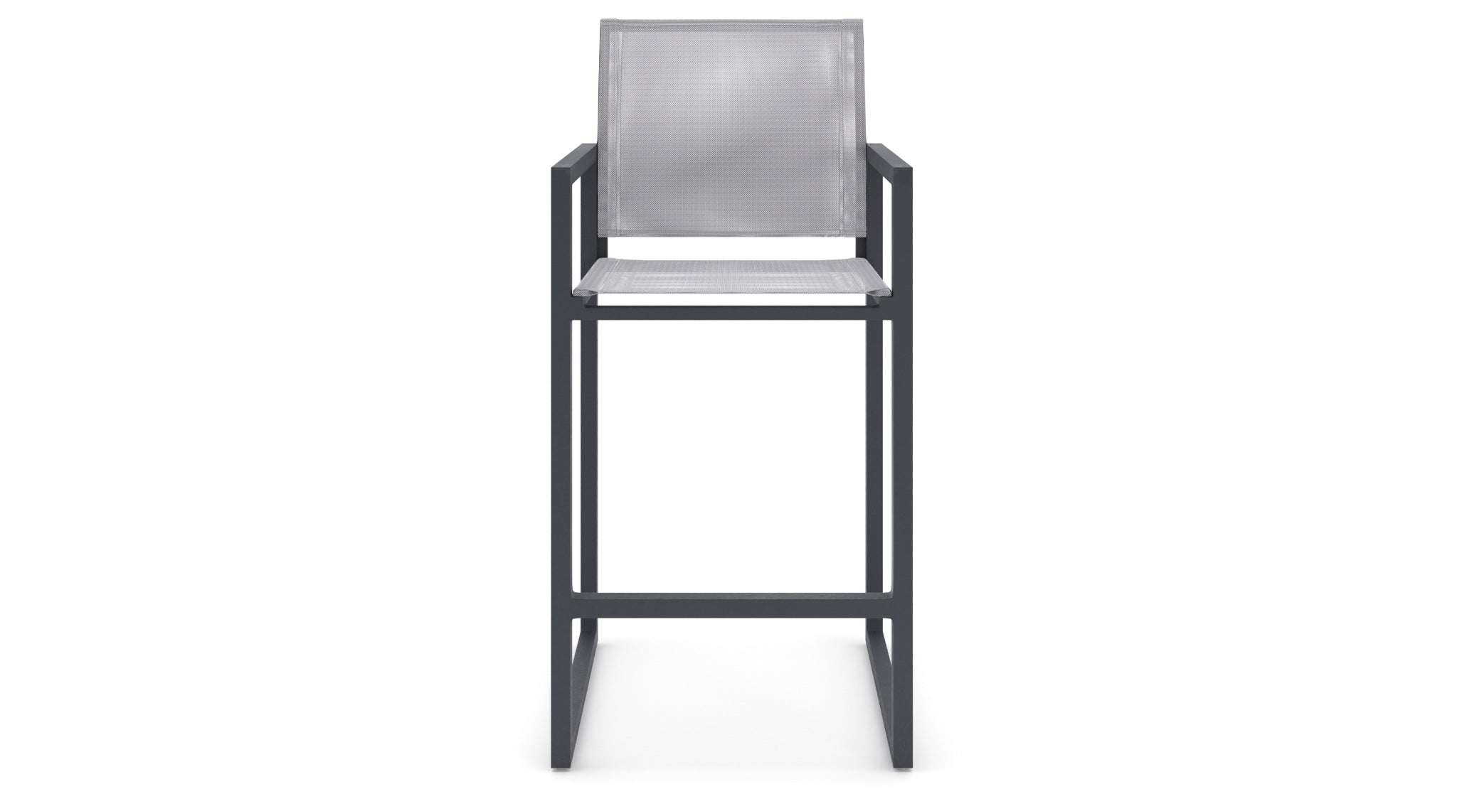 Bar Chairs – Matte black powder-coated aluminum frames with slate gray outdoor performance mesh and teak armrests