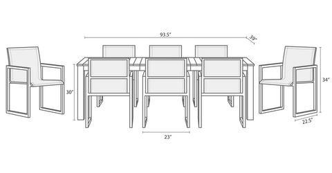 The Pacific Aluminum Dining Set offers outdoor dining for 6 or 8 guests. The table features iron-colored, powder coated aluminum framing topped with aluminum slats. The table is 69”L for 6, and can be extended to 93.5”L for up to 8 guests. The table features an umbrella hole when set up in either size. The set comes with 8 aluminum framed dining chairs with mesh seats and backrests.