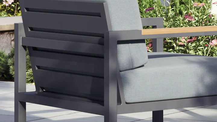 The Pacific Collection features sleek, iron-colored powder coated aluminum frames with teak inlaid armrests, Sunbrella Cast Slate cushions, and angled backrests for natural comfort.