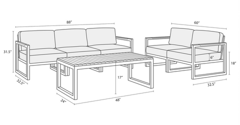 The Pacific Sofa & Loveseat Set includes a 3-piece sofa, 2-piece loveseat, matching coffee table, and all bottom and back cushions.