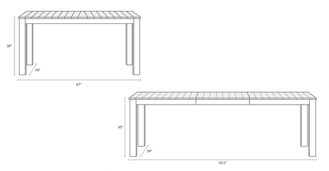 The Pacific Teak & Aluminum Dining Table offers outdoor dining for 6 or 8 guests. The table features iron-colored, powder coated aluminum framing topped with grade A teak. The table is 69”L for 6, and can be extended to 93.5”L for up to 8 guests. The table features an umbrella hole when set up in either size.