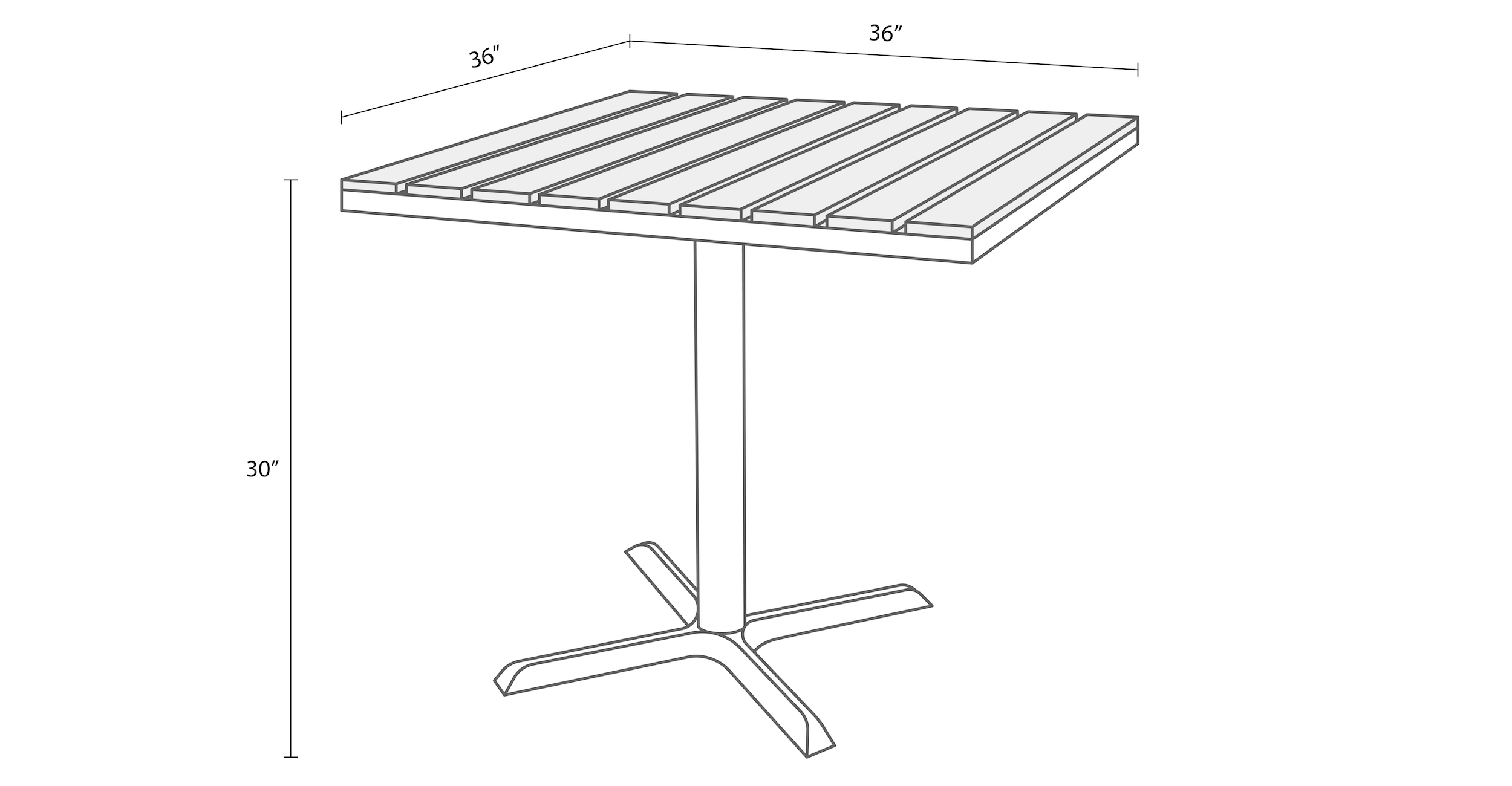 The Asher 4-Top Outdoor Dining Table features natural wood colored synthetic teak slats and charcoal powder coated aluminum framing.