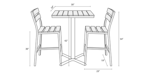 The Asher Outdoor 2-Top Bar Set is built for outdoor restaurant and commercial settings. It is constructed with charcoal powder coated aluminum framing and natural wood colored synthetic teak slats, which make it virtually maintenance free. The set includes the table and base with two bar chairs.