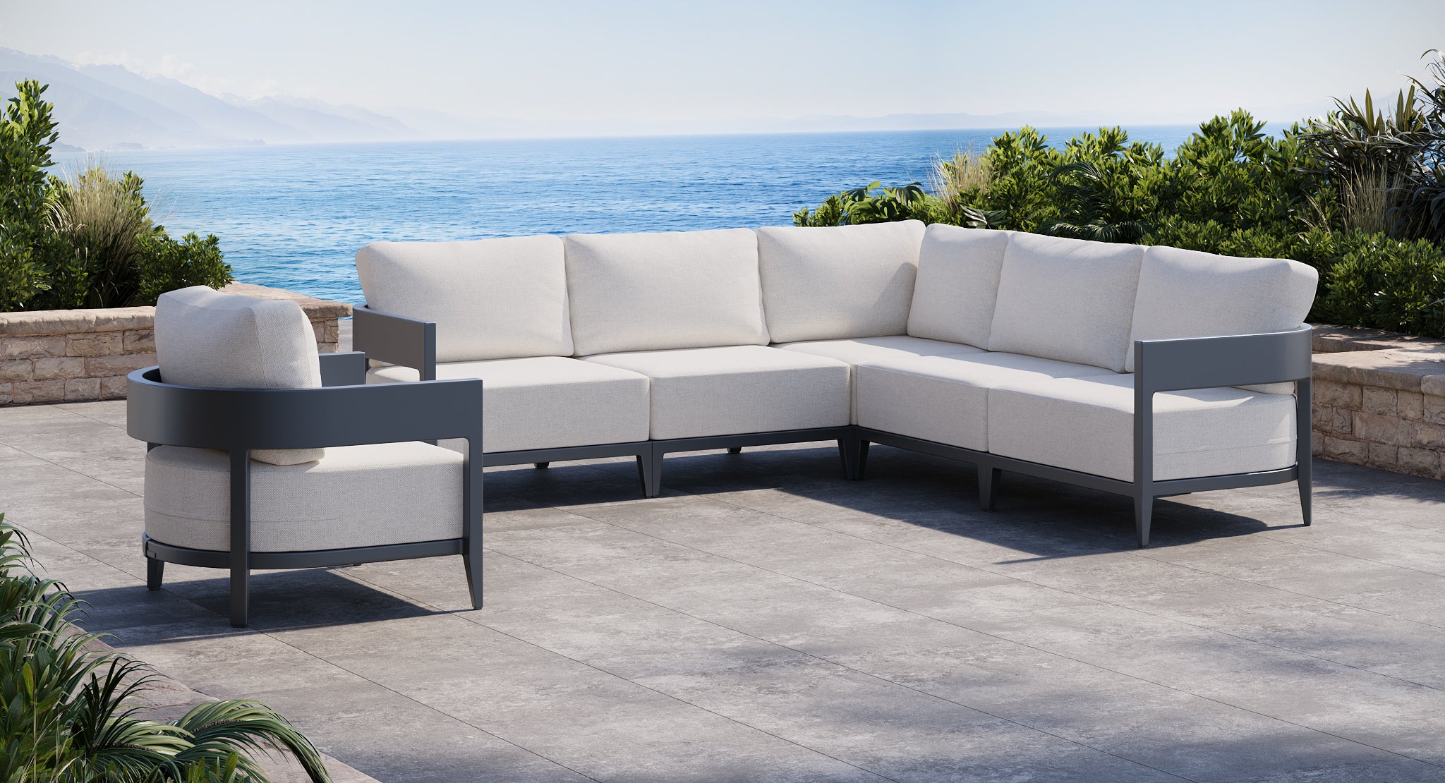 Anchor your outdoor living space with the Atlantic Sectional Set. This expansive arrangement pairs our modular, deep-seated sectional with a matching club chair, creating a cohesive social hub defined by matte gray powder-coated aluminum framing and the collection’s signature curved armrest design. Topped with plush Sunbrella Bliss Linen cushions, this set offers a sophisticated blend of architectural strength and soft, sink-in comfort.