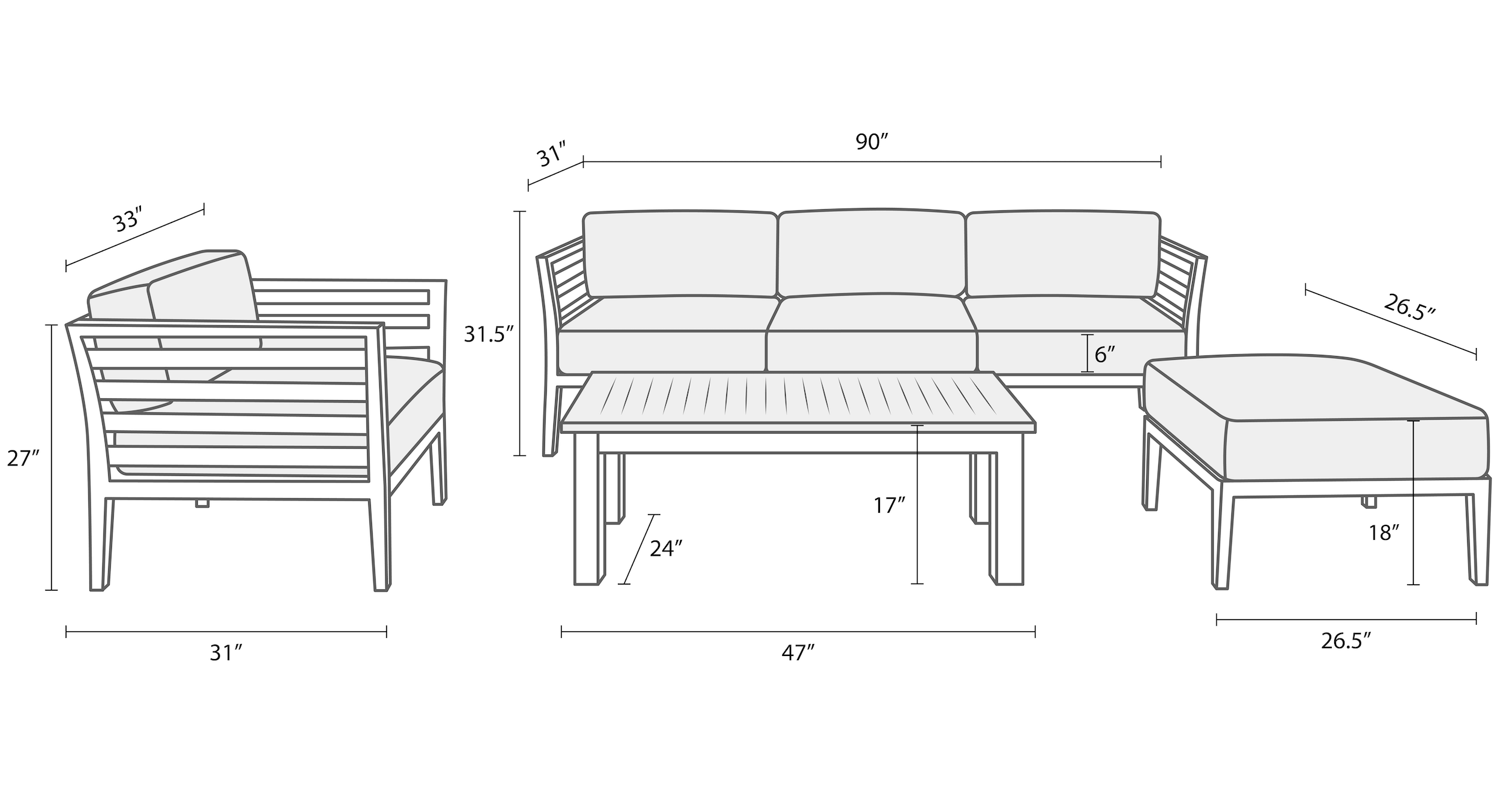6″ seat cushions and back pillows are made of quick drying foam that circulates air and drains water.