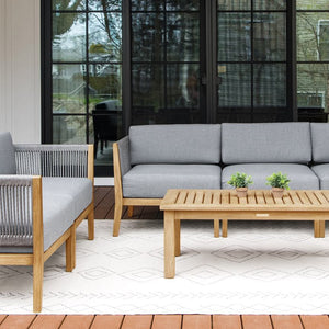 The Capri Teak & Rope Sofa & Loveseat set is a symbol of outdoor luxury that embodies both quality and style. This extensive set comprises a 3-piece sofa, 2-piece loveseat, and matching coffee table, all meticulously crafted from solid Grade A teak. It's adorned with 6” Sunbrella Cast Slate cushions and handwoven with gray all-weather rope.