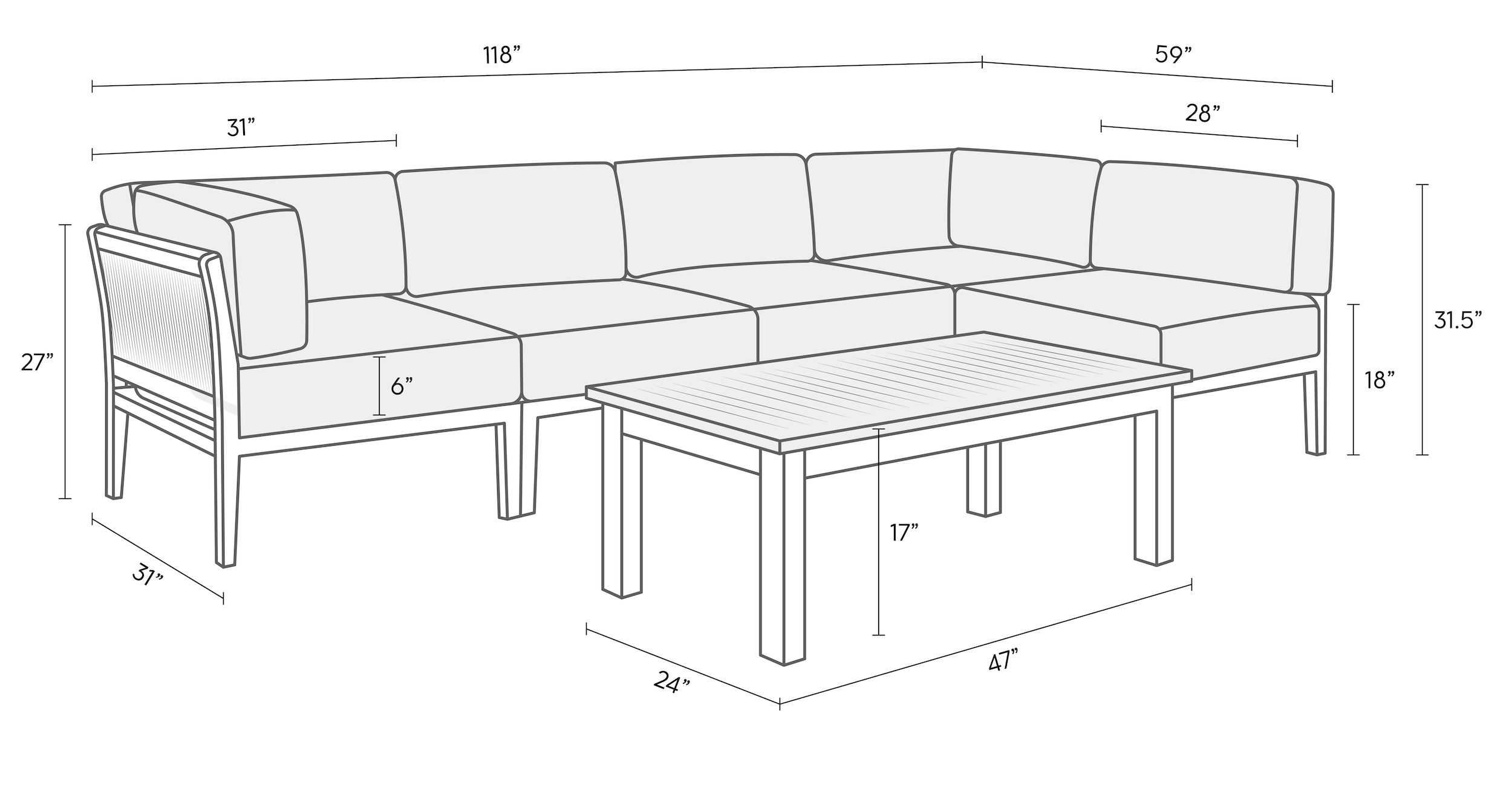 The Malibu Collection is constructed with FSC certified, Grade A teak wood, hand woven espresso all weather rope, and Sunbrella cushions. The versatile design offers an array of configurations to best fit your deck or patio. The Malibu Teak & Rope Outdoor Sectional includes a 5-piece sectional and coffee table.