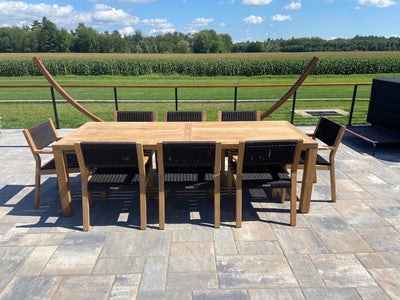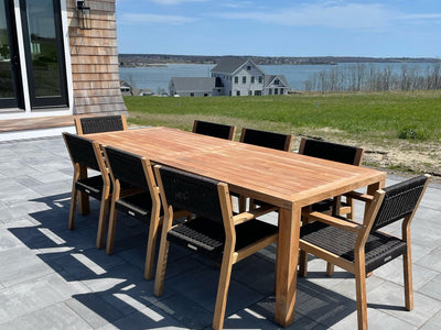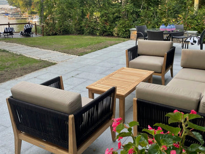 The Malibu Teak & Rope Sofa & Club Chair Set includes a three-piece sofa, two club chairs, and matching coffee table. The set is a perfect match to our Malibu Teak & Rope Dining Sets for 6 and dining sets for 8.