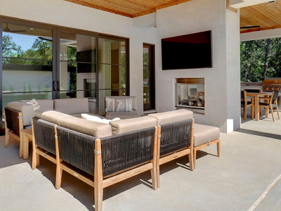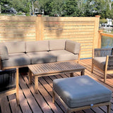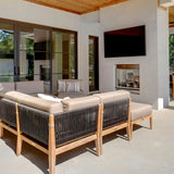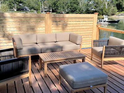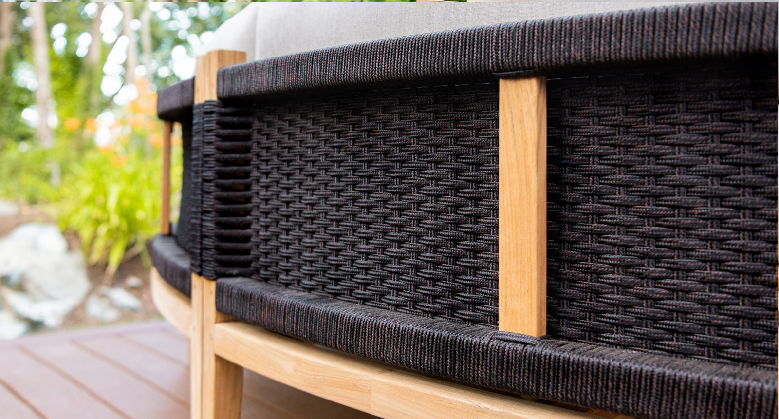The Malibu Collection is constructed with FSC certified, Grade A teak wood, hand woven espresso all weather rope, and Sunbrella cushions. The versatile design offers an array of configurations to best fit your deck or patio.