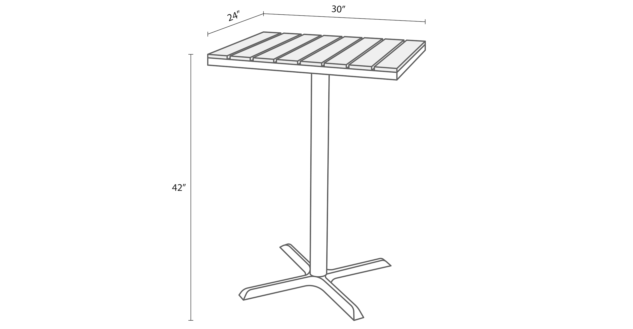 The Milloy 2-Top Outdoor Bar Table features weathered black powder coated synthetic teak slats and silver powder coated aluminum framing.