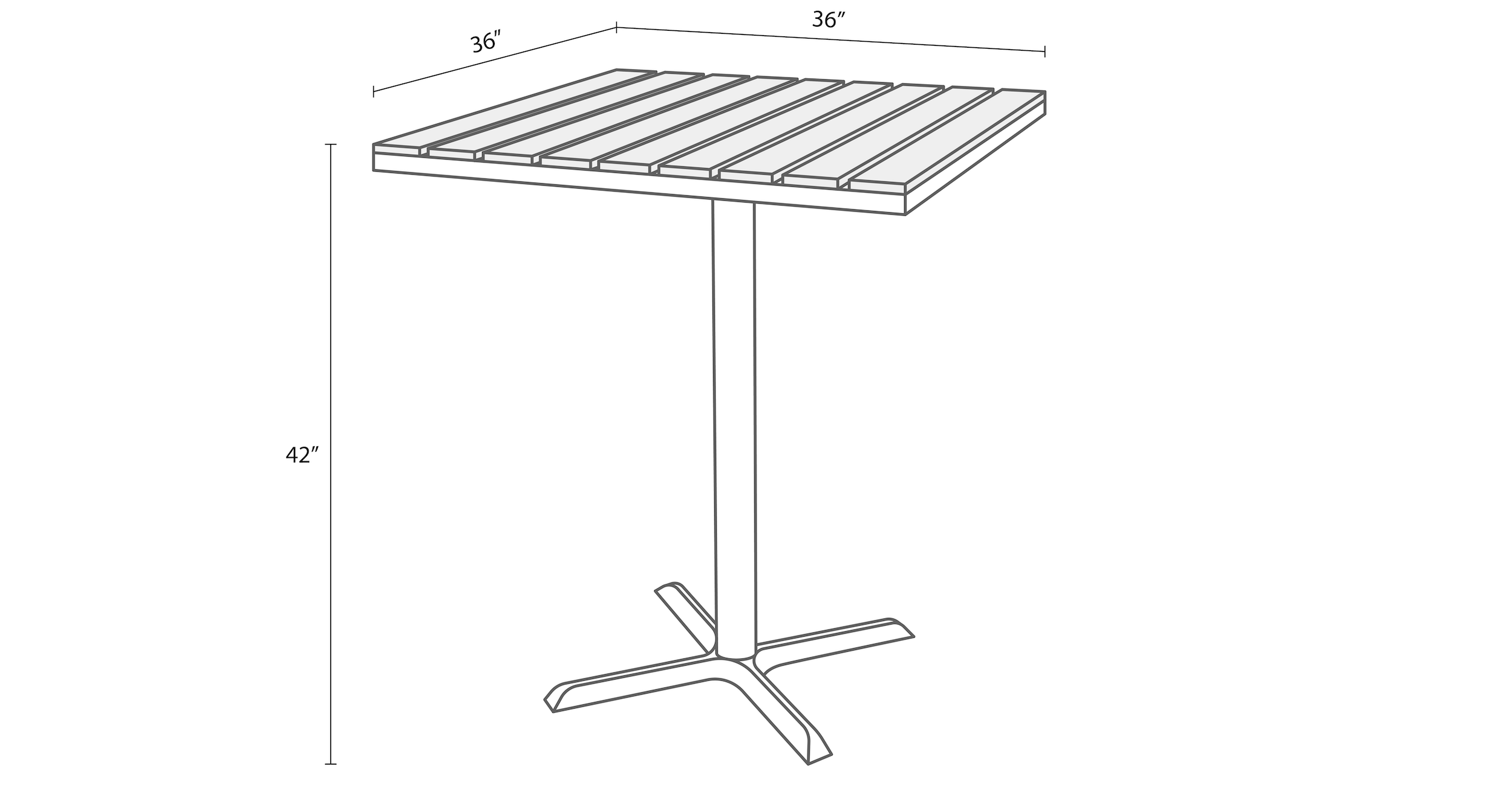 The Milloy 4-Top Outdoor Bar Table features weathered black powder coated synthetic teak slats and silver powder coated aluminum framing.
