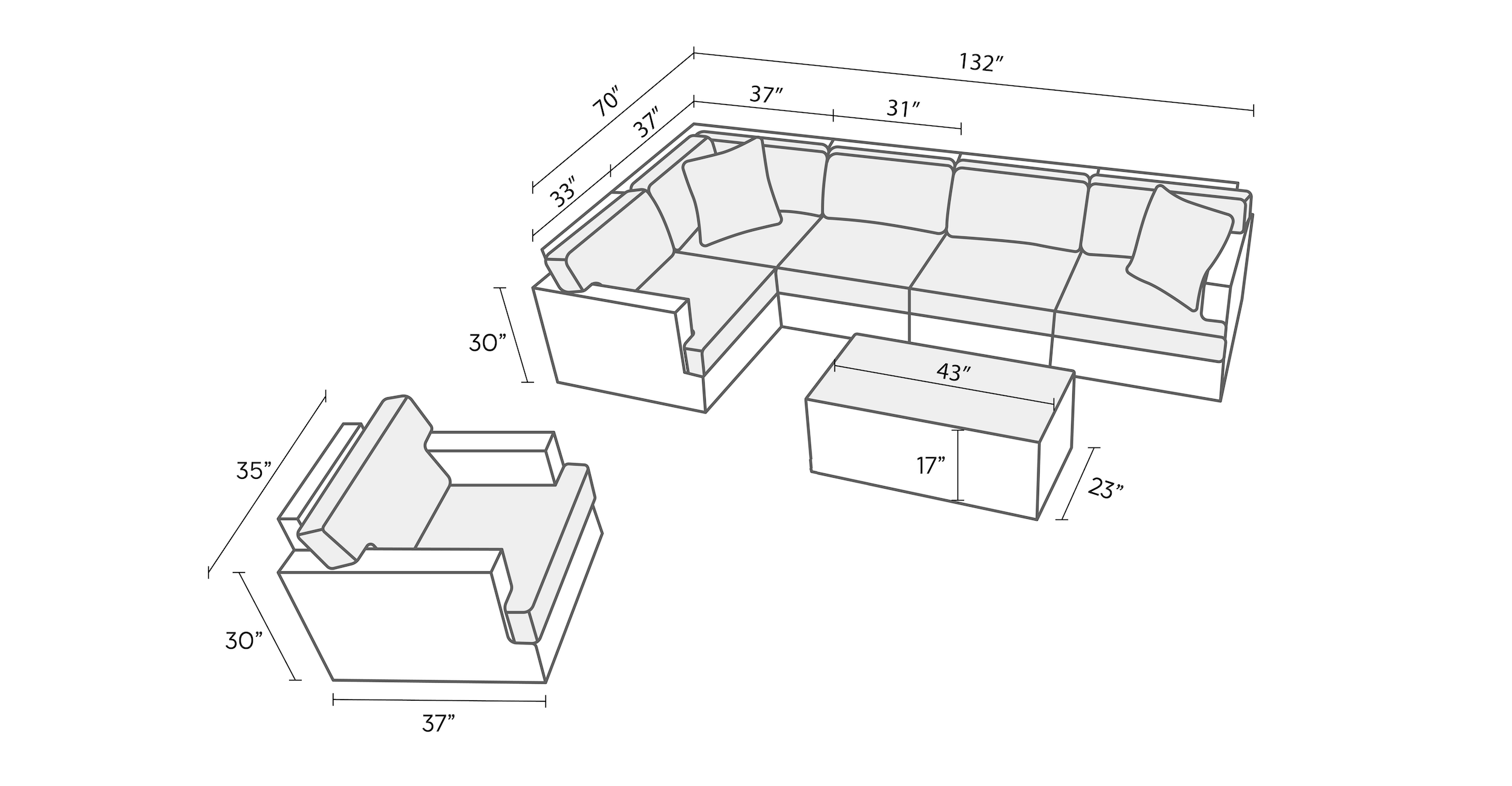 The Mykonos Collection pairs with the Mykonos Dining Sets for 6 and 8 for matching outdoor lounge and dining sets. Additional armless pieces can be added to extend either side of the sectional.