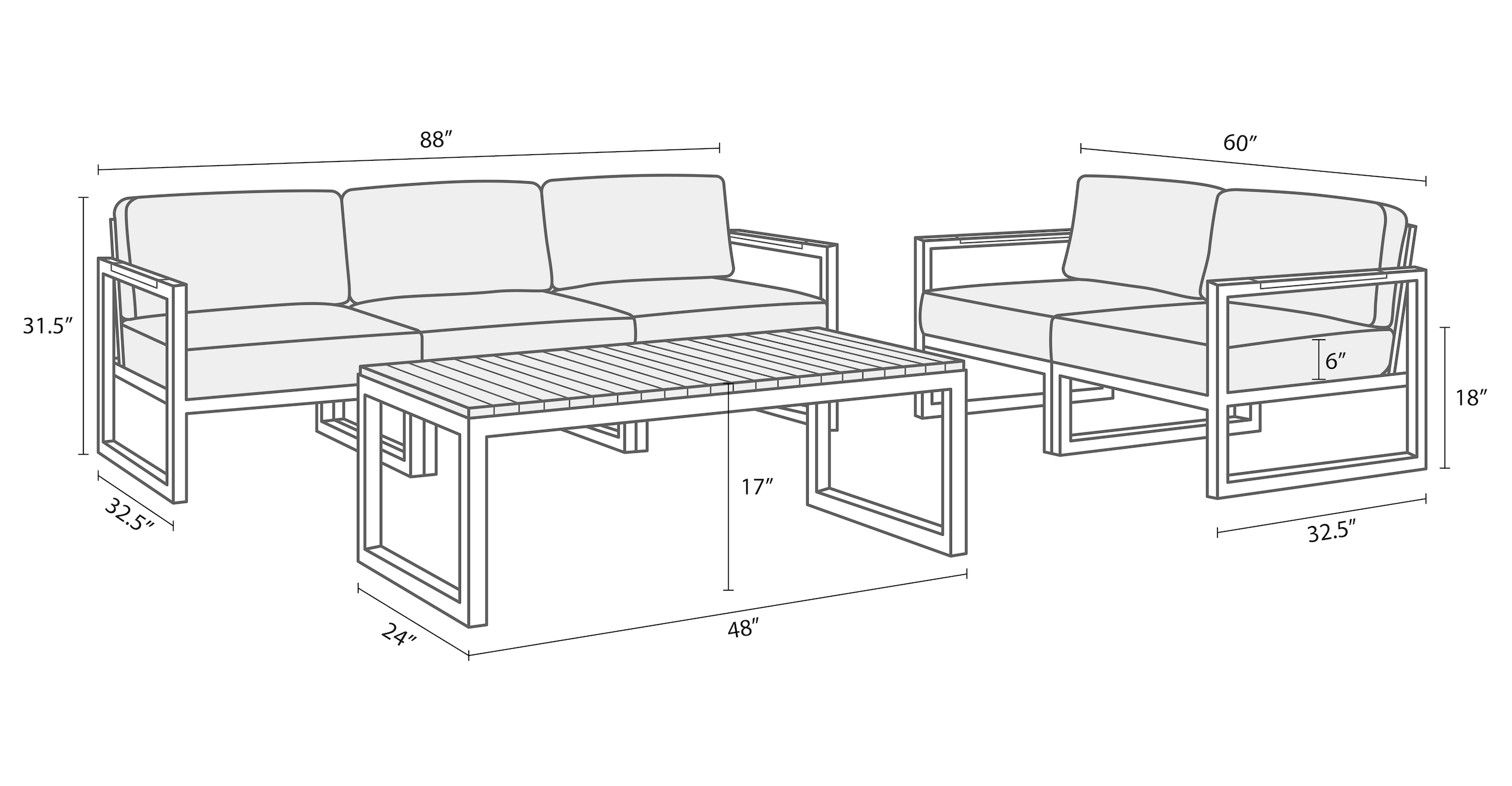 The Pacific Sofa & Loveseat Set includes a 3-piece sofa, 2-piece loveseat, matching coffee table, and all bottom and back cushions.