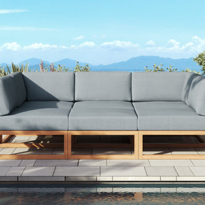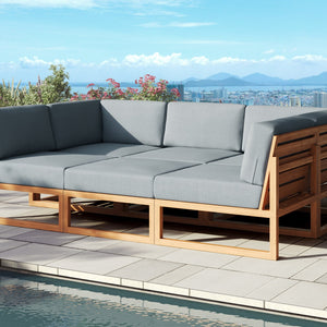 The Pacific Teak daybed includes a 5 piece daybed and matching ottoman. The set can be arranged as pictured, or can be reconfigured into an L shape sectional.