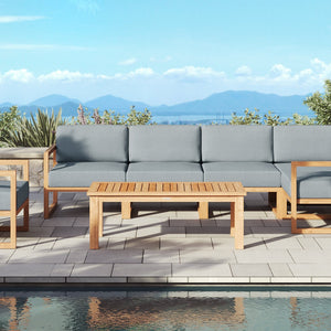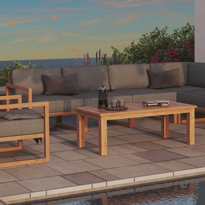 The Pacific Teak Outdoor Sectional Set includes a 5 piece sectional, coffee table, matching club chair, and all bottom and back cushions.