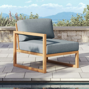 The Pacific Collection is crafted with Grade A teak frames and Sunbrella Cast Slate cushions. The design features angled backrests for natural comfort.