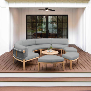 The Gray Teak & Rope Santorini includes a 5 piece curved sofa, 3 ottomans, and coffee table. It is the ultimate design for entertaining guests or lounging with the family. The set pairs with the Capri Teak & Rope Dining Sets for 6 and 8 for matching lounge and dining, or any lounge pieces from the Capri Collection to add additional seating.