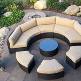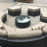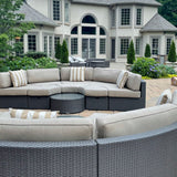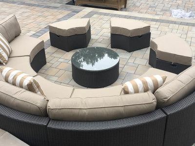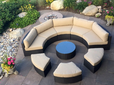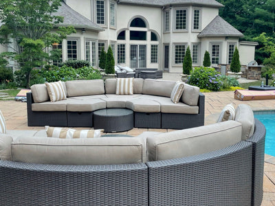 The Santorini is a round outdoor sectional that is built to entertain. The exact design is truly unique to Madbury Road, and you will not find another set exactly like this on the market. The ottomans can be used as seating, or they can be turned around to fit flush against the inside of the sectional to create an outdoor daybed. The set comes in our sand color fabric – a shade that meshes with any setting and matches all colors of throw pillows.